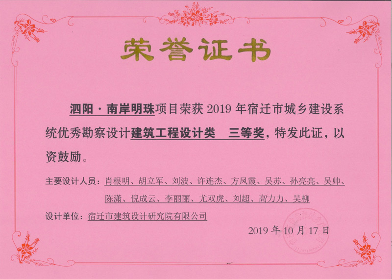 1、泗陽 南岸明珠 榮獲建筑工程設(shè)計(jì)類 三等獎(jiǎng)